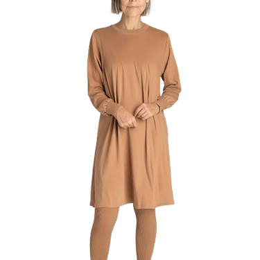 "Este vestido tipo sudadera se puede combinar de manera informal con un par de zapatillas o uggs con un par de botas o botines. El material es grueso como el de una sudadera. Yo diría que es un poco pequeño. Mido 1,70 m y peso 215 libras y tengo la XL. Normalmente tengo algo de espacio extra cuando compro una XL, pero este vestido me queda perfectamente. En general, un lindo vestido."